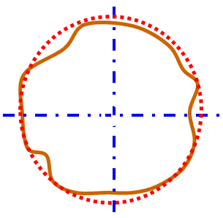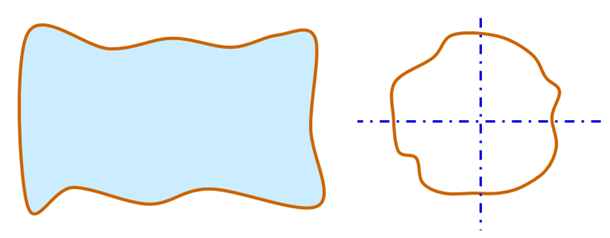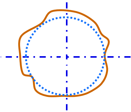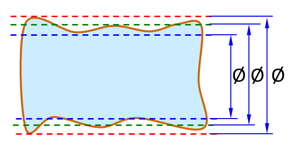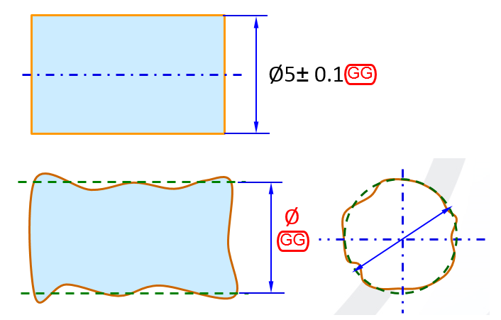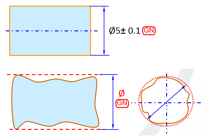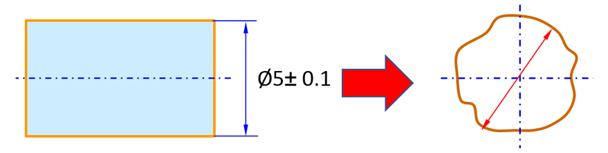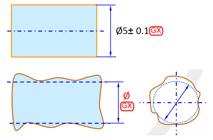 现在我们讨论一下真实的案例:如果实际产品做出来出现变形(地球人都知道任何零件做出来都会不完美),把问题进一步延伸到产品和测量,问题就可能变得比较复杂。首先轴会出现全长弯曲;其次,每个截面的圆形都有误差,那么请问设计工程师的直径公差到底想要表达哪个直径?