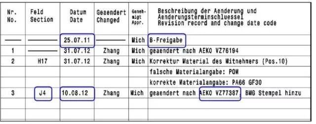 这里面,改哪了(第二列),什么时候改的(第三列),谁改的(第四列),谁批准的(第五列),主要变更内容(第六列)。