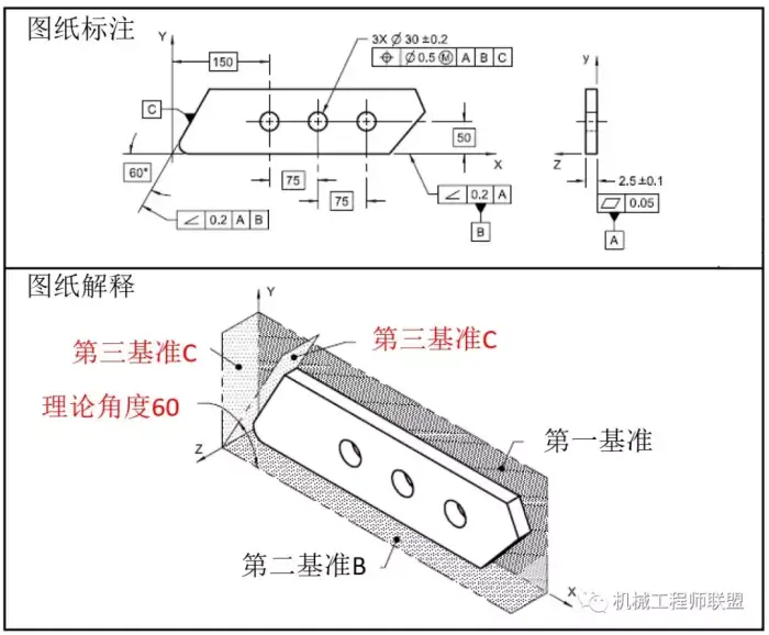 在众多的基准标注中,其中最常见的就是平面作为基准,如下图标注所示: