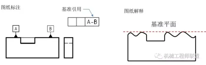 有时图示标注,两个或多个平面一起当作基准,比如A-B,表示公共基准,既然是公共基准,就表示两个实际表面要一起拟合出一个大的相切平面,如下图所示。