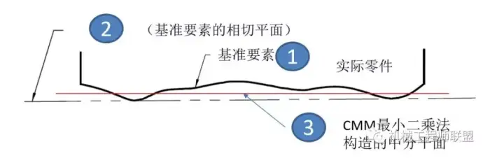 图纸上标注的A基准是一个理想平面,实际零件加工出来A不可能是一个理想平面,A平面有形状误差,实际表面如下图所示,实际表面叫做基准要素。那么基准A到底是下图中那个?是实际表面1?还是中分平面2?还是材料外面的相切平面3?